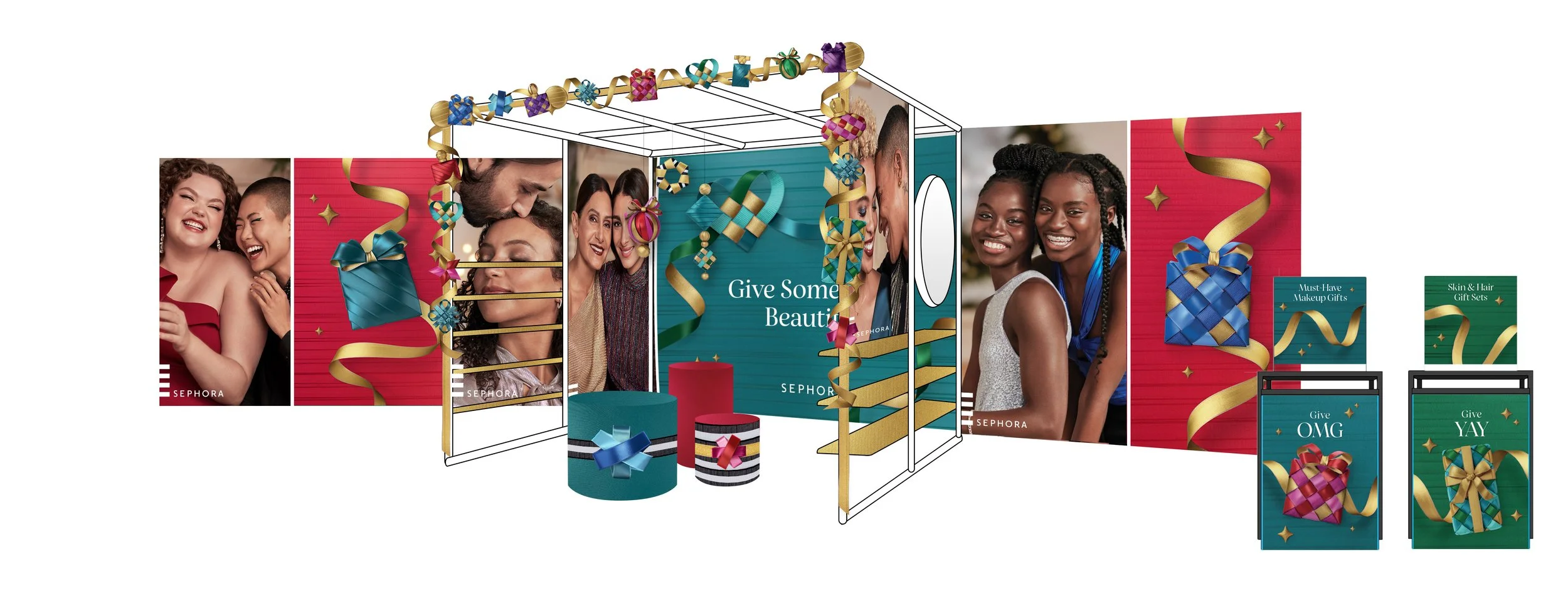 For Sephora’s 2022 holiday campaign, I designed 3D retail installations for the brand’s New York City flagships in Times Square and SoHo. The concept brought the Give Something Beautiful campaign to life, translating CGI–created woven holiday cues into immersive, gift-inspired environments that transformed key in-store spaces.